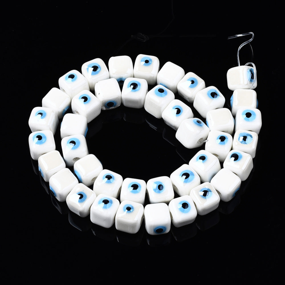 Hebra de cuentas de cubo de porcelana de mal de ojo blanco