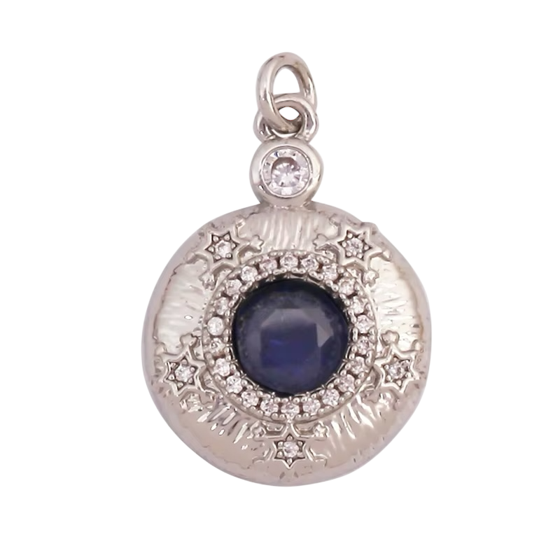 18k Silver Plated Flat Round Pendant With Blue Zirconia 22mm, 1pc