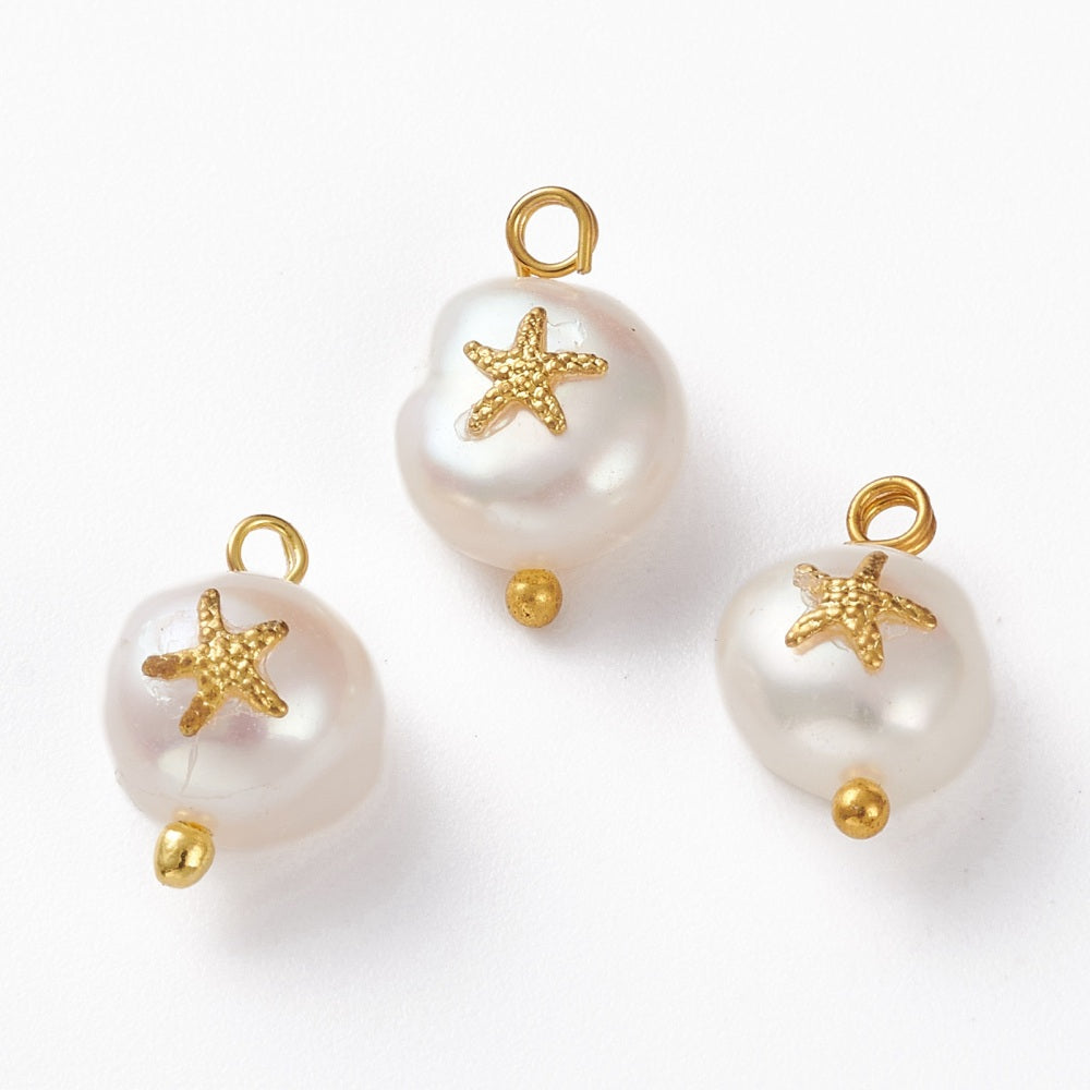 Natural Pearl Pendant with Gold Starfish 13mm, 4pcs