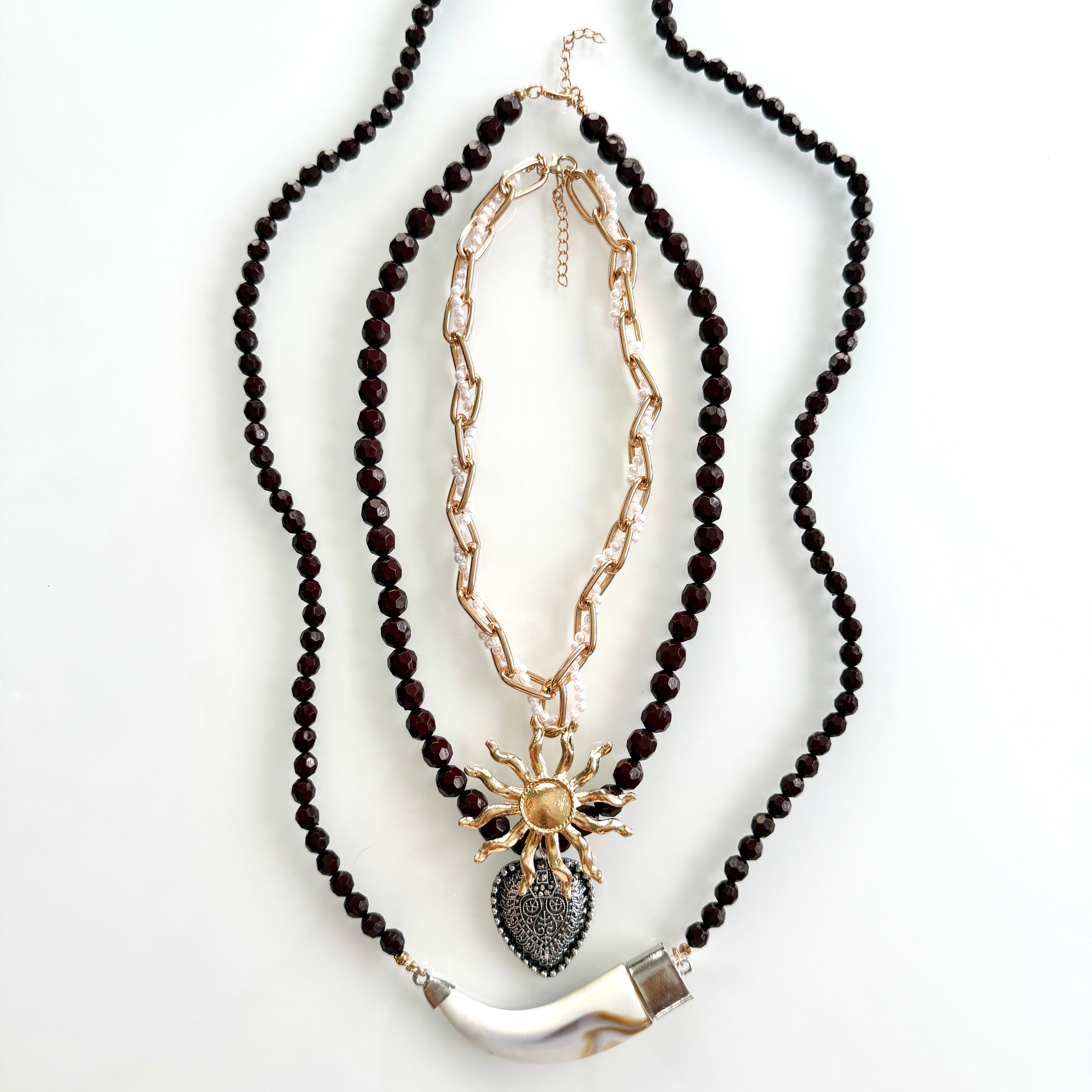 Triple-Layer Necklace featuring Resin Beads and Gold Chain With Pendants,